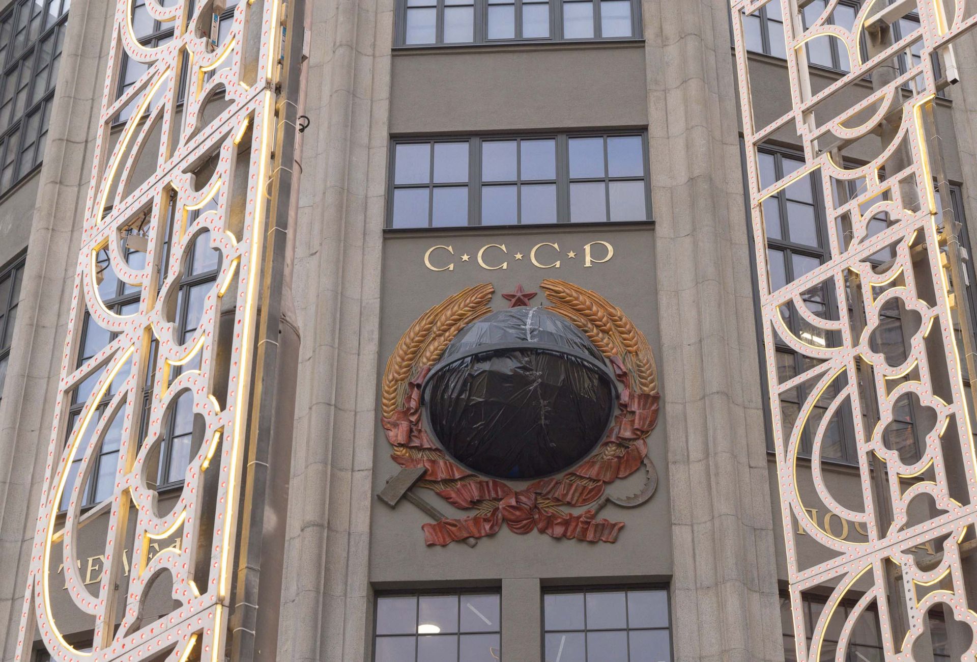 Le bâtiment restauré du Télégraphe Central se dévoile peu à peu : la façade est presque entièrement ouverte, les côtés partiellement, et l'arrière est encore entièrement recouvert d'un filet. Le globe sur l'emblème est symboliquement enveloppé de cellophane noir. Le long de la rue Tverskaïa jusqu'à la place Pouchkine, il y a des parterres de fleurs en granit à plusieurs niveaux avec de nombreux sapins décorés : ici, ils sont vivants et plantés en terre.