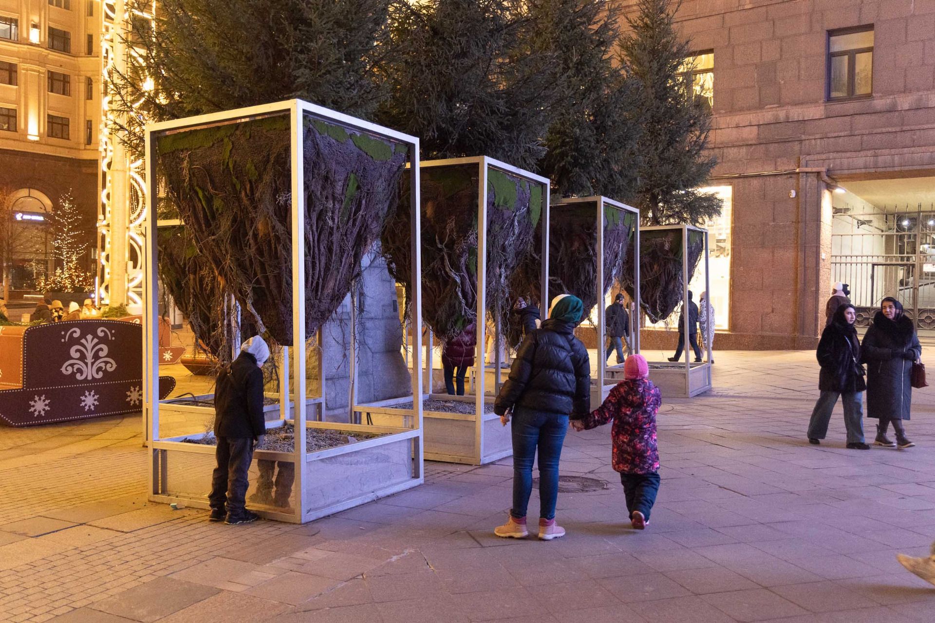 À l'intersection de Kamergersky et Tverskaïa, des sapins sont suspendus. Si l'on ne s'approche pas, on a l'impression qu'ils ont simplement été arrachés du sol et exposés à la vue de tous. Les gens s'arrêtent, les regardent avec étonnement, beaucoup les prennent en photo, et certains les touchent pour soudain réaliser que les racines ne sont pas réelles – c'est un élégant cache-pot en forme de racines. « Original, bien sûr, à faire une fois, mais ce serait mieux s'ils étaient debout », dit une femme d'âge moyen.
