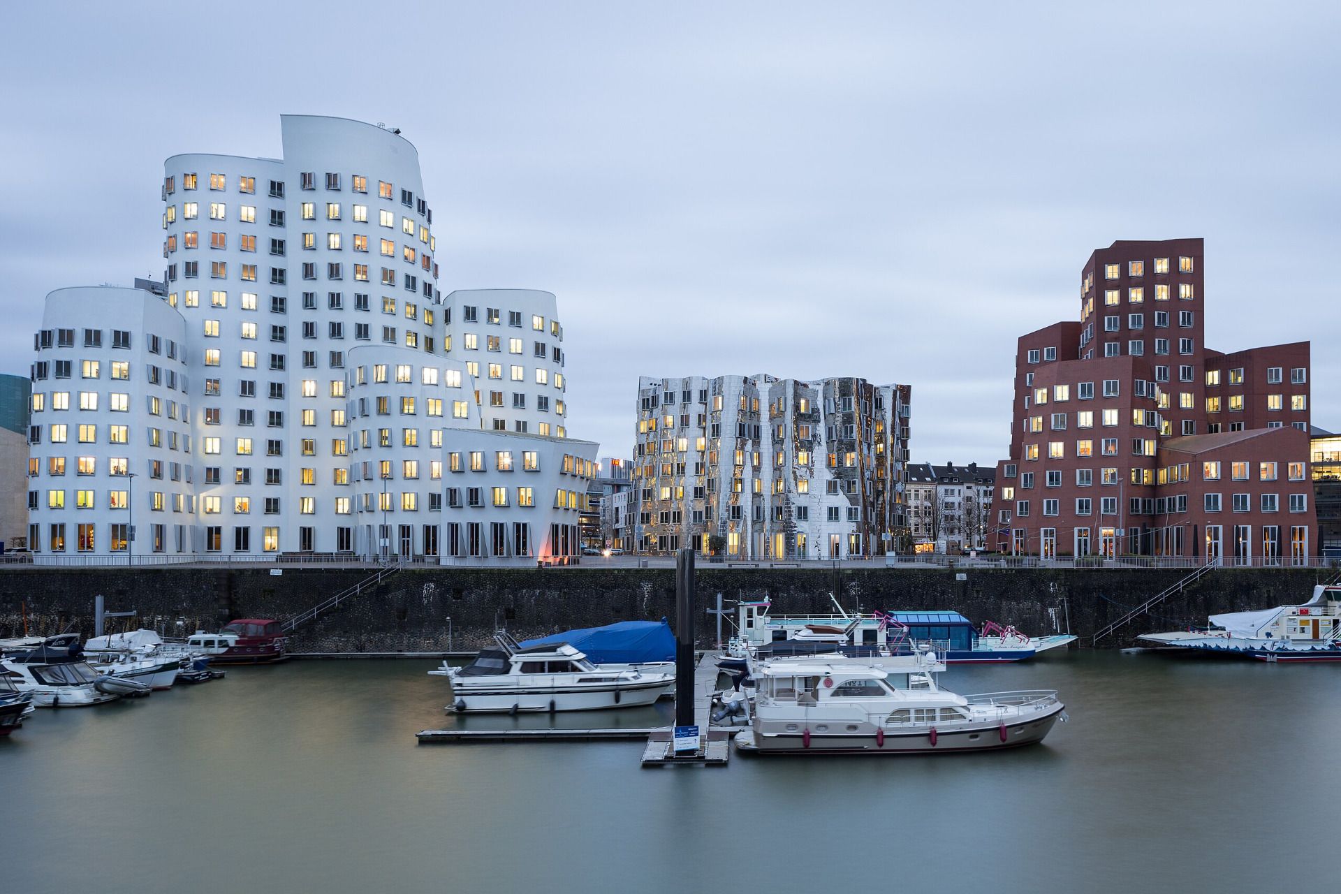 Не было тогда и комплекса Новой Таможни (1999) в Дюссельдорфе, на берегу Рейна, когда-то занятом грязным металлургическим производством. Изначально предполагалось, что строить там будет Заха Хадид — имя, которое в списке деконструктивистов всегда упоминается вместе с именем Гери. По каким-то причинам её проект отменился, и строил он. Покрыв центральное здание комплекса (из трёх, стоящих рядом) гнутыми стальными пластинами, таким образом, чтобы стены напоминали колеблющуюся на ветру мятую ткань, он покрасил соседние два здания, сложенные из антропоморфных секций, в красно-кирпичный и белый. Они смотрятся в это стоящее посередине кривое зеркало и вместе с ним образуют ансамбль, который уже четверть века воспринимается как городской символ.