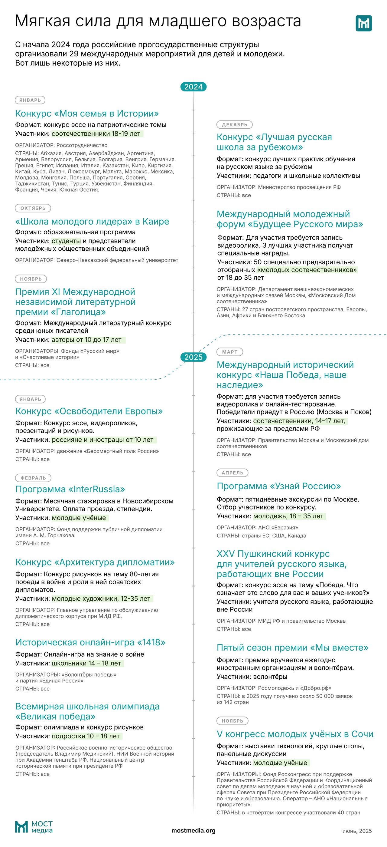 С 2022 года стремительно расти число всевозможных международных конкурсов, программ, олимпиад и учебных программ, рассчитанных в первую очередь на иностранных школьников и вообще молодежь. Впрочем, некоторые ориентированы и на взрослых — на функционеров пророссийских организаций, учителей русского языка, ученых. Организаторы разные — и официальные правительственные учреждения, и псевдообщественные объединения, часто созданные именно с этой целью. Все они в той или иной степени связаны со спецслужбами. Финансируются эти конкурсы, как правило, правительственными грантами и созданы по примерно одной и той же схеме.