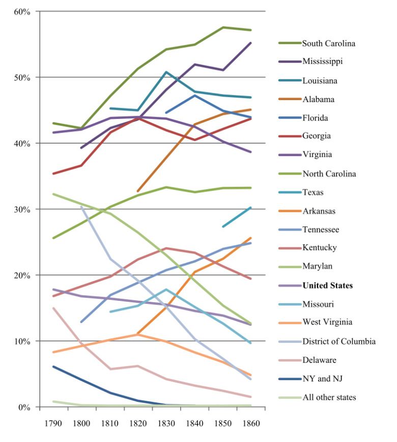 Динамика доли рабов в населении разных штатов до 1861 года. Как видно, в ключевых штатах Юга этот показатель стабильно рос — едва ли рабство отмерло бы там без внешнего принуждения. Инфографика: Wikipedia / MHz`as