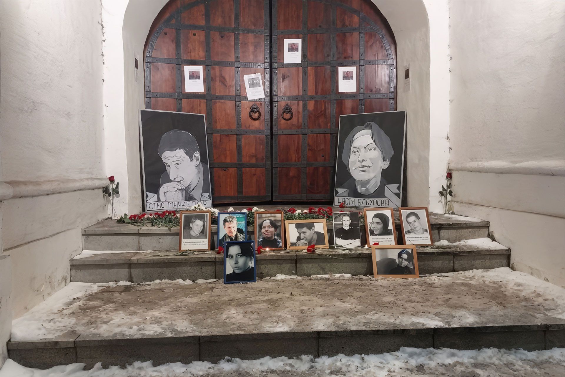 Справа от мемориала стоят Леонид и Вера. Молодые люди увлеклись политикой после начала войны. Вера была на акции памяти убитых антифашистов в прошлом году, а Леонид пришёл впервые. Он узнал о Бабуровой и Маркелова накануне акции — посмотрел документальный фильм Валерия Балаяна «Любите меня, пожалуйста» в московском правозащитном центре «Открытое пространство»: