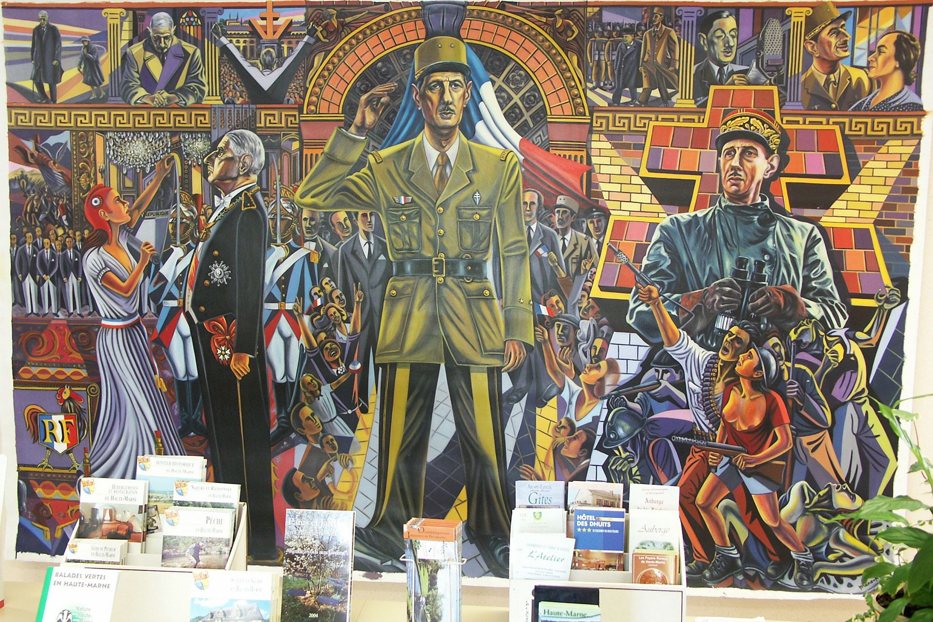 Панно, изображающее сцены из жизни Шарля де Голля, в туристическом офисе в Коломбэ-ле-Дёз-Эглиз. Фото: Wikipedia