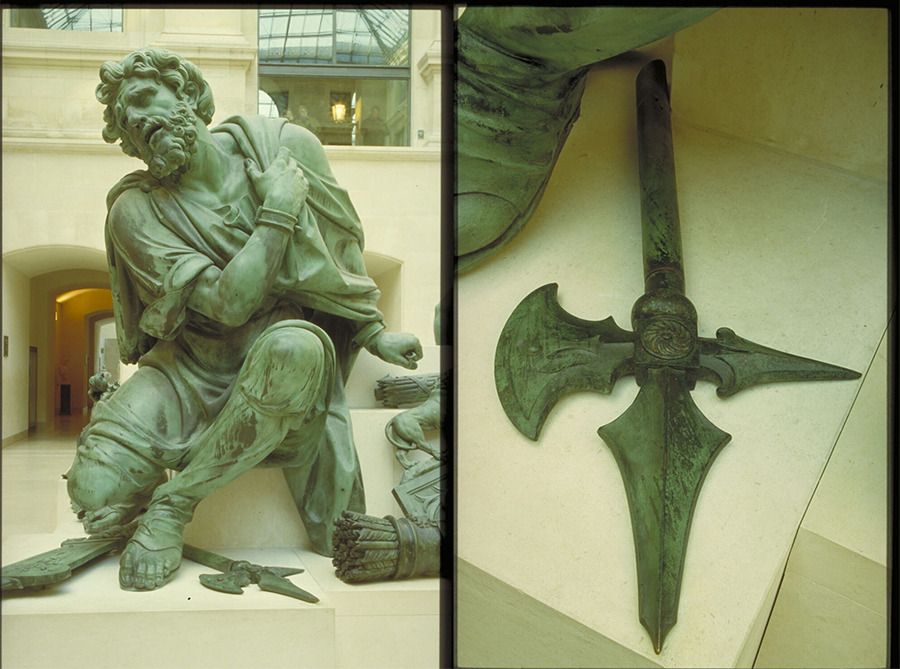 Поздно ночью 18 января 1995 года у бронзового Бранденбурга авторства Мартена Дежардена исчезла алебарда. Статуя не держала ее в руках — сломанное оружие лежало у неё под ногой. Но все равно это было удивительное происшествие. Статуя стояла во дворе Пюже, накрытом сверху стеклянным потолком, в нем постоянно дежурили четыре сотрудника службы безопасности. Саму алебарду не так-то просто унести: она длиной 1,3 метра и весит 17 кг. Тем не менее оружие исчезло бесследно. А 30 января алебарда была найдена лежащей у подножия пирамиды Лувра.