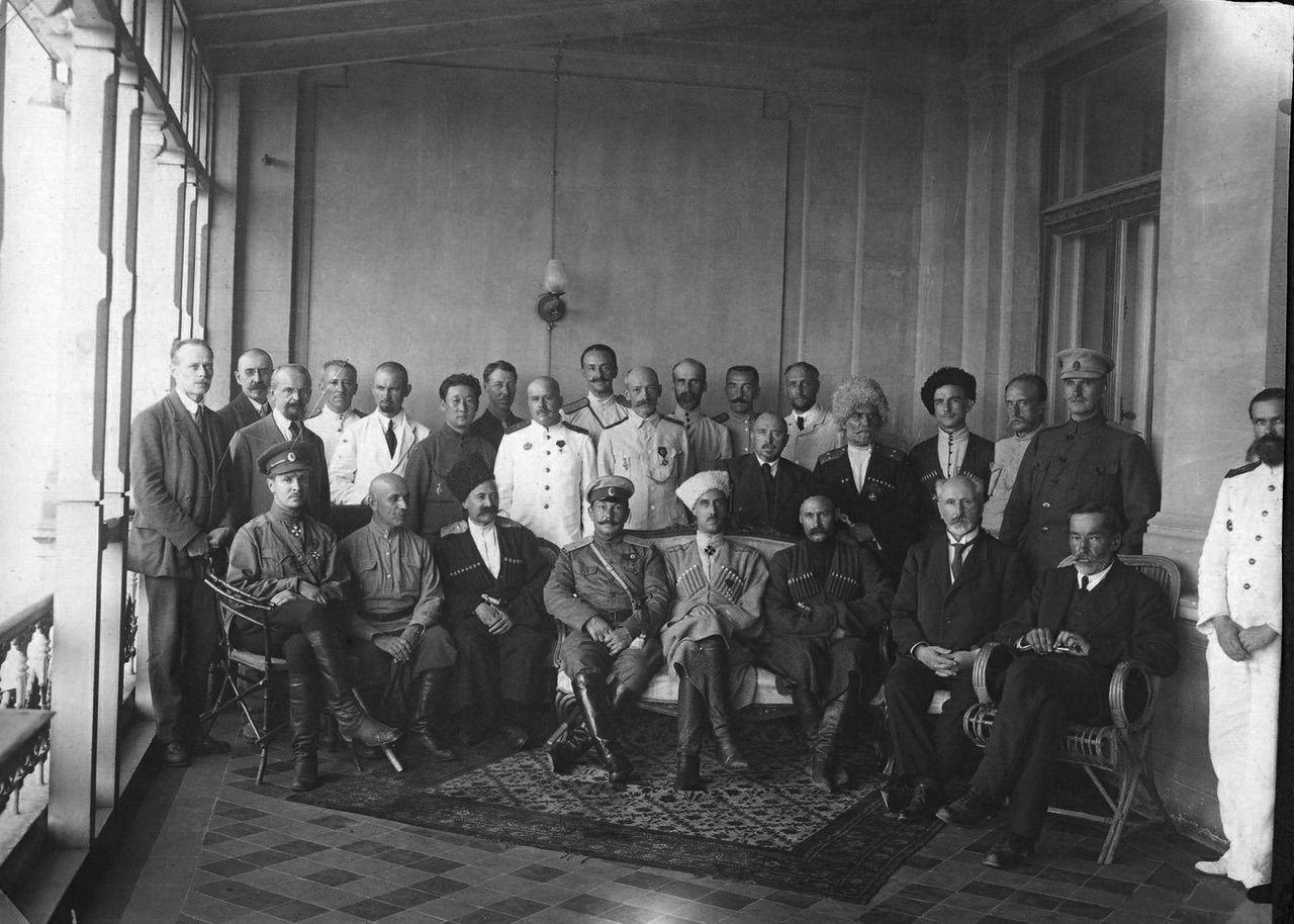 Врангель (сидит в центре) с членами своего правительства. Крайний слева — начальник штаба Русской армии генерал-лейтенант Пётр Шатилов, второй справа — председатель правительства Александр Кривошеин. Фото: Wikipedia / неизвестный автор