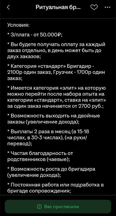 В обязанности члена бригады входит «перенос гроба с телом усопшего из морга в катафальный транспорт и на кладбище (крематорий), заезд в храм, при необходимости». Один заказ, как обещает подрядчик, длится от трех до пяти часов. От кандидата на эт вакансию ожидают «умение проявлять эмпатию, пунктуальность, опрятный внешний вид, соблюдение формы одежды, исполнительность».