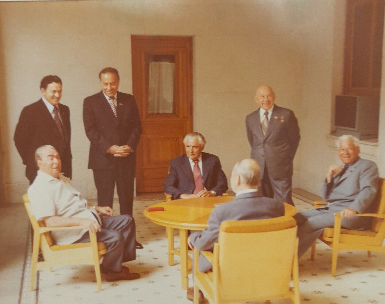 Щербицкий (сидит в центре) на отдыхе в Крыму с высокопоставленными фигурами из окружения Леонида Брежнева, 1981 год. Изображение: Wikipedia