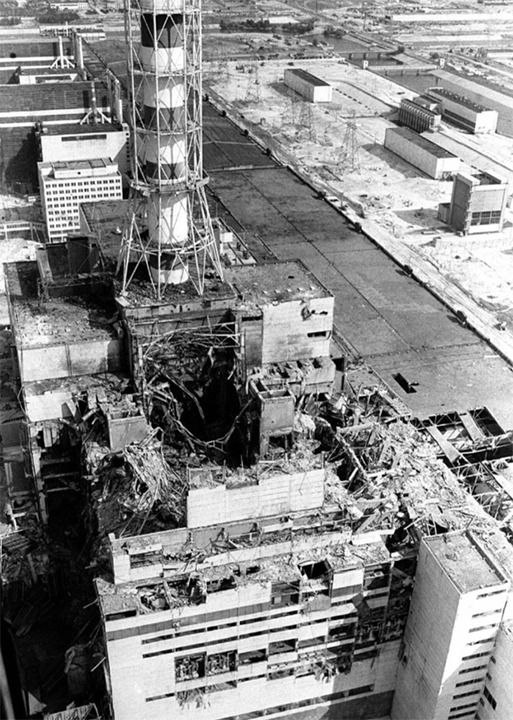 Разрушенный энергоблок №4 в первые часы после взрыва, 26 апреля 1986 года год. Изображение: Wikipedia / IAEA Imagebank