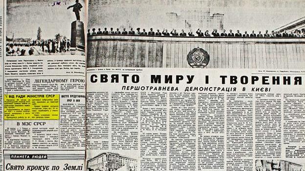 Характерный пример одного из первых сообщений о катастрофе в украинских газетах: короткая заметка спрятана за большим репортажем о Первомае. Изображение: Би-Би-СИ