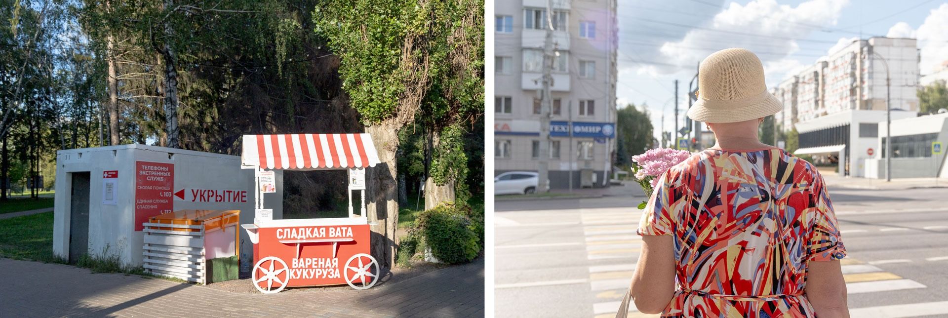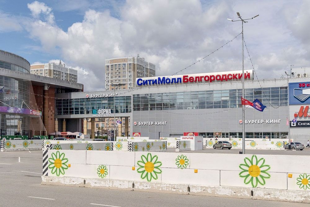 Сити-Молл находится на окраине Белгорода на пересечении трасс, ведущих в Харьков. Одно из укрытий неподалеку до сих пор хранит на себе следы осколков. Сам ТЦ обтянут антидроновой сеткой, парковка обложена бетонными блоками. Видимо, чтобы как-то разрядить атмосферу, блоки разрисовали ромашками. Рядом с парковкой Сити-Молла торговые ряды — там продают овощи, фрукты и цветы. Спрашиваем у пожилого продавца яблок, не боязно ли ему торговать рядом с Сити-Моллом — он спокойно отвечает, что ничего страшного: обстреливают, но не часто.