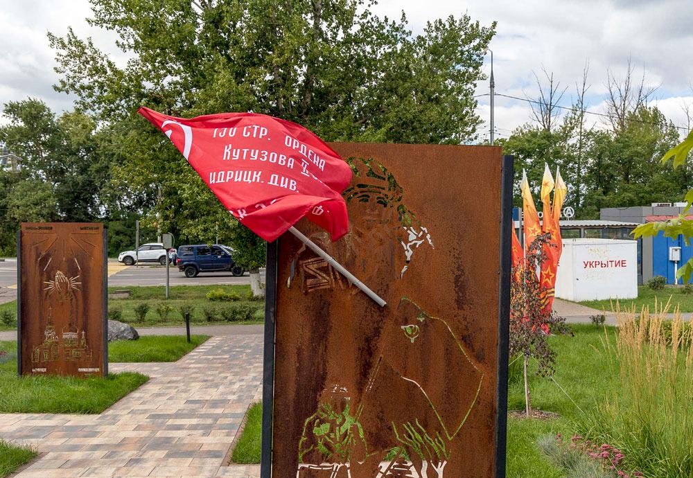 «Будем жить» — это «сквер СВО» на выезде из поселка. Там установили шесть металлических панно из состаренной (кортеновской) стали, на которых, по словам губернатора, «отображены трагические события и символы специальной военной операции: 30 декабря, дом на Щорса 55А [он обрушился 12 мая 2024 года во время обстрела ВСУ — Мост.Медиа], Алёшка, бабушка со знаменем Победы, защитники-военнослужащие и многое другое». Есть также панно с изображениями Крещения Руси и трагедии в Одесском Доме профсоюзов.