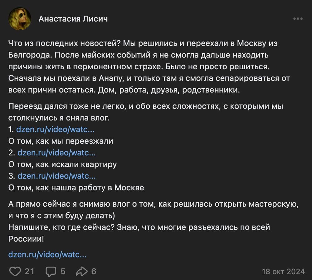 Сама Анастасия Лисич, судя по ее записям в соцсетям и адресе ее студии, переехала в Москву, потому что «после майских событий» не смогла оставаться в Белгороде из-за постоянного страха.