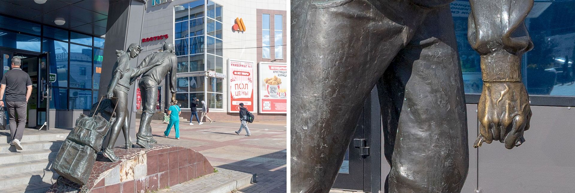Рядом с известным аналогом западной сети фастфуда на улице Попова, между аптекой и остановкой (с укрытием, само собой) — скульптурная группа «Челноки». В сегодняшних обстоятельствах, когда тысячам жителей Белгородчины пришлось покинуть свои дома из-за обстрелов, навьюченные багажом челноки выглядят двусмысленно. Кстати, у одного из них украли сумку.