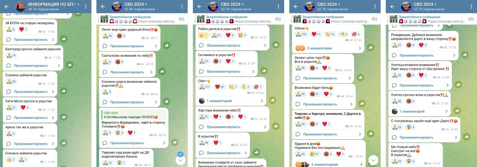 В местных телеграм-каналах практически онлайн выдается информация об опасности атак БПЛА, их маршруте, типе и даже, порой, захвате конкретной цели.