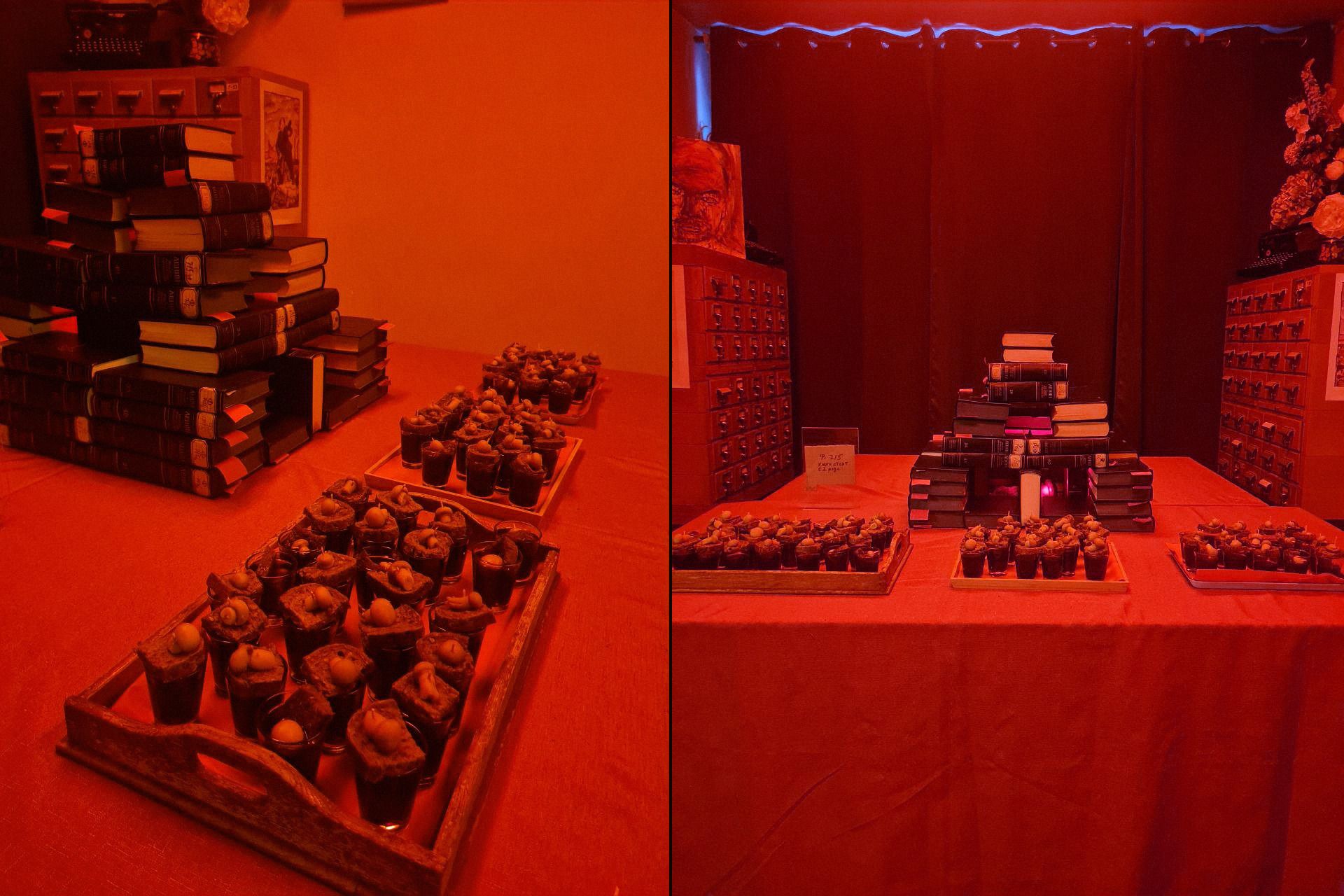 Пока музыкант Женя Куковеров наигрывает эмбиэнтные вариации, в которых иногда можно расслышать тему похоронного марша Шопена, социолог Александр Бикбов в желто-голубом полосатом свитшоте дирижирует «очередью к мавзолею». Действительно, в одном из библиотечных залов сотрудники Тургеневки выстроили из полного собрания сочинений Ленина макет его мавзолея на Красной площади (её олицетворяет красная подсветка в библиотечном зале). Внутри инсталляции покоится гриб-муляж, а перед ней стоят стопки с красным вином, накрытые кусочками черного хлеба с маринованными шампиньончинками. Всё вместе это отсылает зрителя к знаменитой телемистификации Сергея Курёхина «Ленин — гриб».