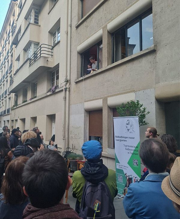 Вечером 22 апреля тихая улица Валанс, на которой расположена Русская общественная библиотека имени Тургенева, непривычно оживлена. На тротуаре у подъезда в окружении примерно сотни зрителей негромко играет гитарист. Редкие прохожие с любопытством поглядывают на президента библиотеки Аглаю Ашешову, одетую по моде начала XX века: