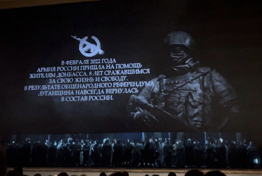 Музыка в самом деле потрясающая, но что же, спрашивается, мешало этому сочинению жить на нашей сцене прежде? Да ничего, просто сейчас удачный момент. В кошмарном сне Прокофьеву не могло присниться, что уготовит Гергиев его героям и зрителям дальше. Слайды с титрами описывают сначала 1919 год, потом 1943-й, за ним сразу памятный 2014-й. И оттуда мы перескакиваем в 2022-й ( «где вы были восемь лет?»), когда «армия России пришла на помощь жителям Донбасса, 8 лет сражавшимся за свою жизнь и свободу. В результате общенародного референдума Луганщина навсегда вернулась в состав России».