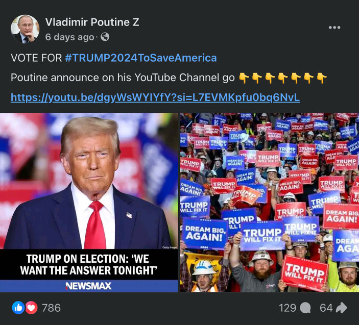 Пример публикации с профиля Vladimir Poutine Z: скрытая манипуляция общественным мнением через поддержку Трампа. Такие посты выглядят как внутренняя политическая агитация, но за счет использования псевдопрофилей, подобных этому, становятся частью масштабной иностранной информационной кампании.