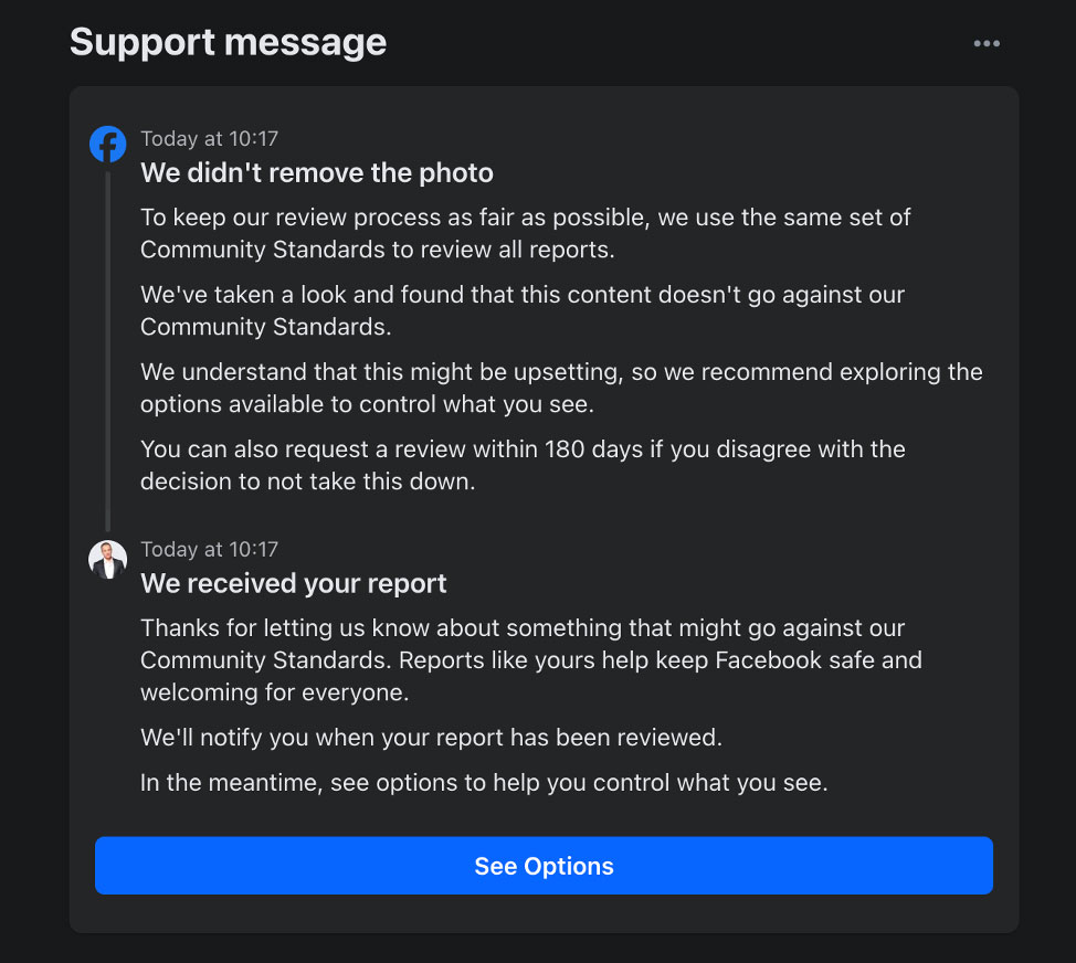 Один из ответов от службы поддержки Facebook гласит: "Мы не удалили фото. Мы проверили и обнаружили, что этот контент не нарушает наши Стандарты сообщества." Сообщение также предлагает пользователям "использовать доступные опции, чтобы контролировать то, что они видят", вместо удаления проблемного контента. Этот пример, как и многие другие, иллюстрирует, что Facebook не рассматривает публикации с символикой "Z" или изображениями российских военных как нарушение, несмотря на их пропагандистский характер.