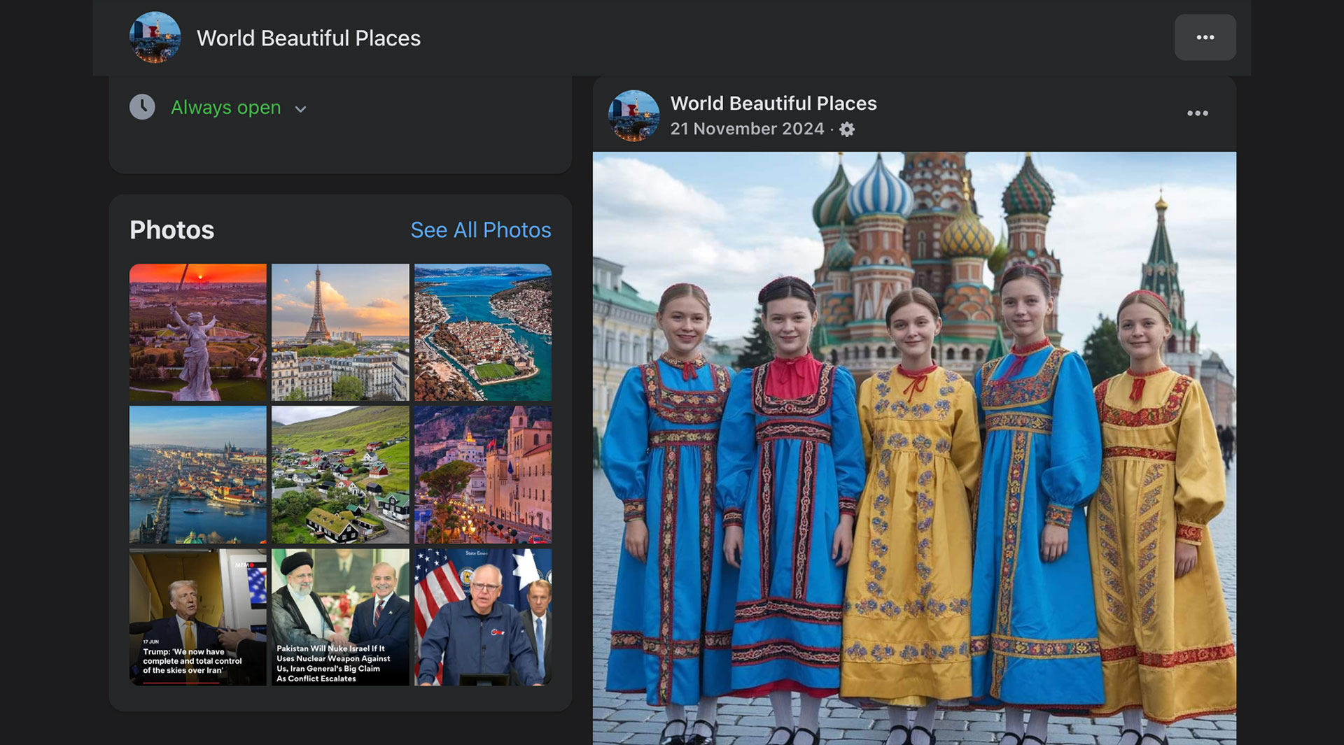 Сперва может показаться, что эта страница содержит контент с иллюстрациями достопримечательностей разных стран, но, если пролистать ленту ниже, то видно, что контент преимущественно пророссийский и пропагандистский. Яркий пример — публикация карты Украины с подписью "Russia"